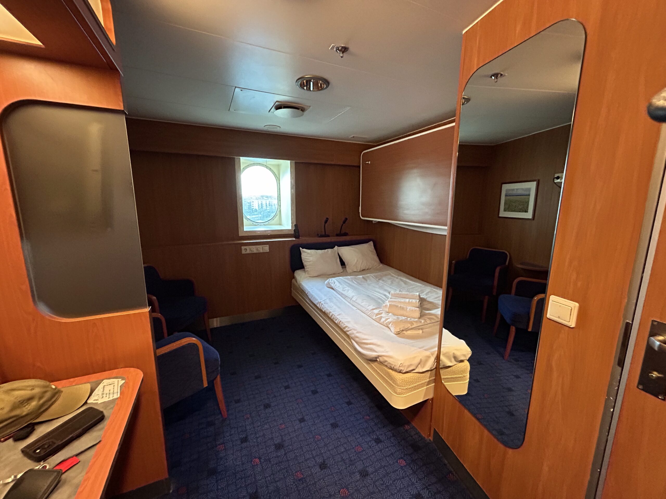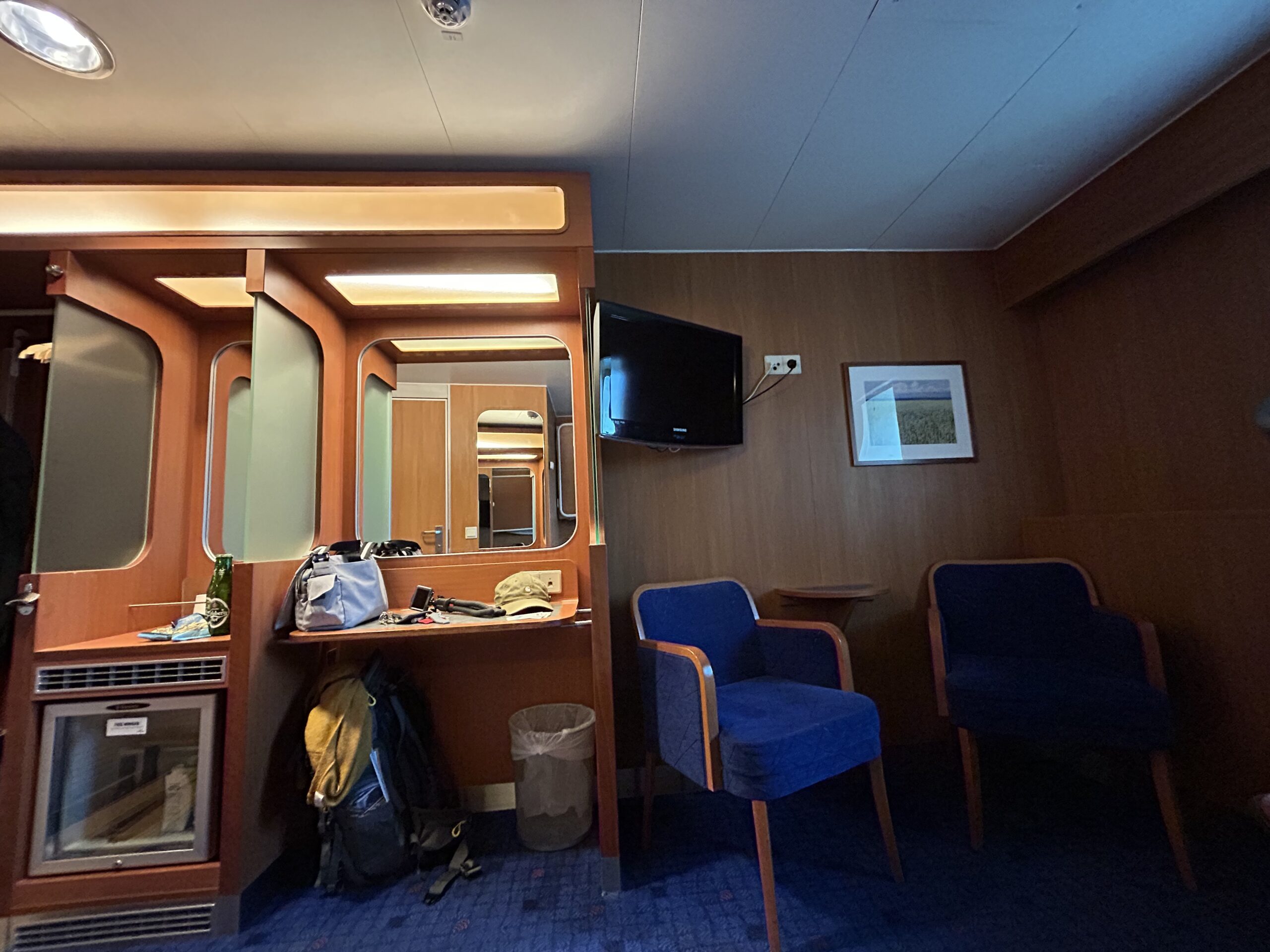 Gegen 17 Uhr standen wir dann auch am Check-In im Hafen, kurz nach 18 Uhr waren wir bereits auf dem Schiff. Dank eines Upgrade hatten wir eine Business-Kabine mit (gefüllter) Minibar for free und genügend Platz.