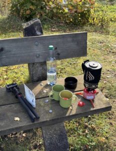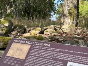 Dann gehts dann weiter nach Norden. Es ist sonnig und zwischendurch immer wieder mal neblig und am Straßenrand stehen erste Warnschilder wegen den Elchen. Wir halten wir mal an einer mittelalterlichen Kirchenruine in Hamneda die verwunschen auf einem Hügel steht und kochen uns einen Kaffee am See. Man merkt, die Nacht war kurz, die Fahrt macht müde. Elche sehen wir keine. Nur Rehe.