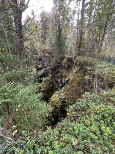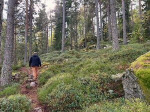Im Högbergsfältet befindet sich Tilas Stoll, eine historische Eisenerzmine. Bereits im frühen Mittelalter wurde hier Eisenerz entdeckt und die reichhaltigen Erzadern machten das Gebiet schnell zu einer bedeutenden Quelle für die Eisenproduktion in Schweden. Heutzutage sind nur noch einige Stollen im Wald zu sehen, mal kleiner, mal größer, mal tiefer. Sehr beeindruckend. Die Wanderwege selbst sind aber auch schon so sehr schön. Und hier ist es schon deutlich herbstlicher als es in Mariestad oder auch bei uns war.